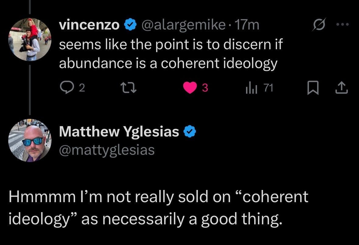 There becomes a point where expansiveness begets incoherence. As a political faction, I think abundance is past that point. Our dear friend Matt has also said this explicitly: